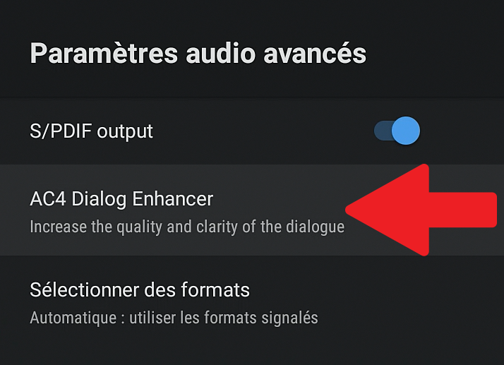 La seconde option AC4 Dialog Enhancer permet d'augmenter le niveau sonore des dialogues. Pour accédez à cette option, cliquez dessus à l'aide du bouton OK de votre télécommande.