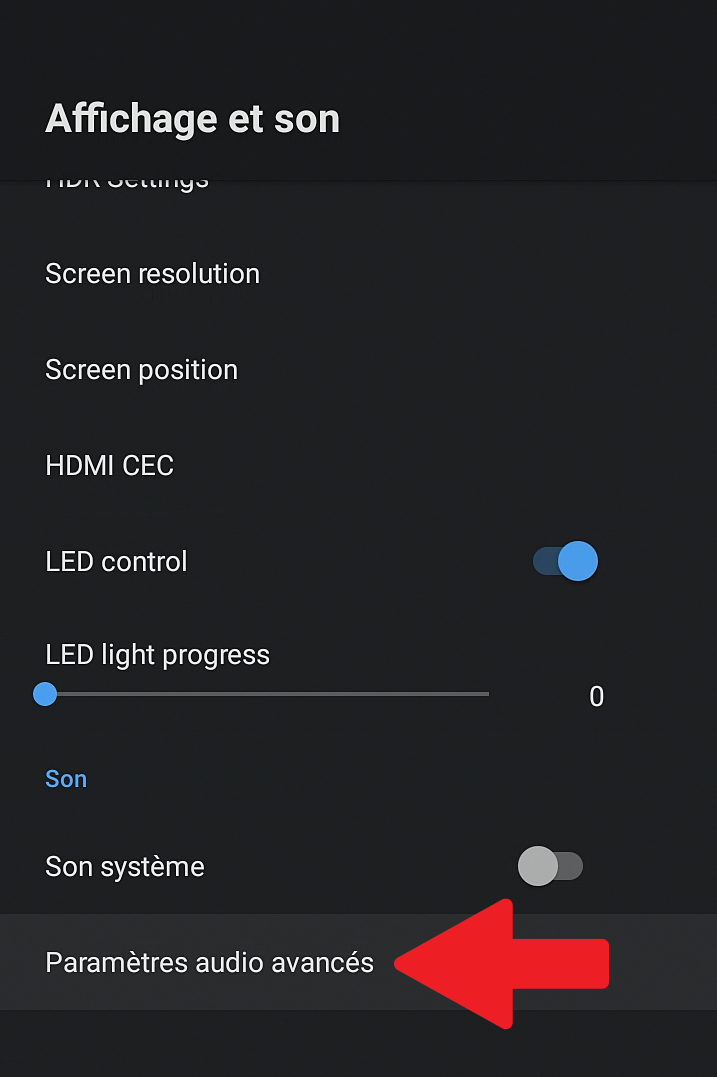 Puis, à l'aide de la touche FLECHE BAS de votre télécommande, descendez jusqu'au bouton "Paramètres audio avancés", puis cliquez dessus à l'aide du bouton OK de votre télécommande.