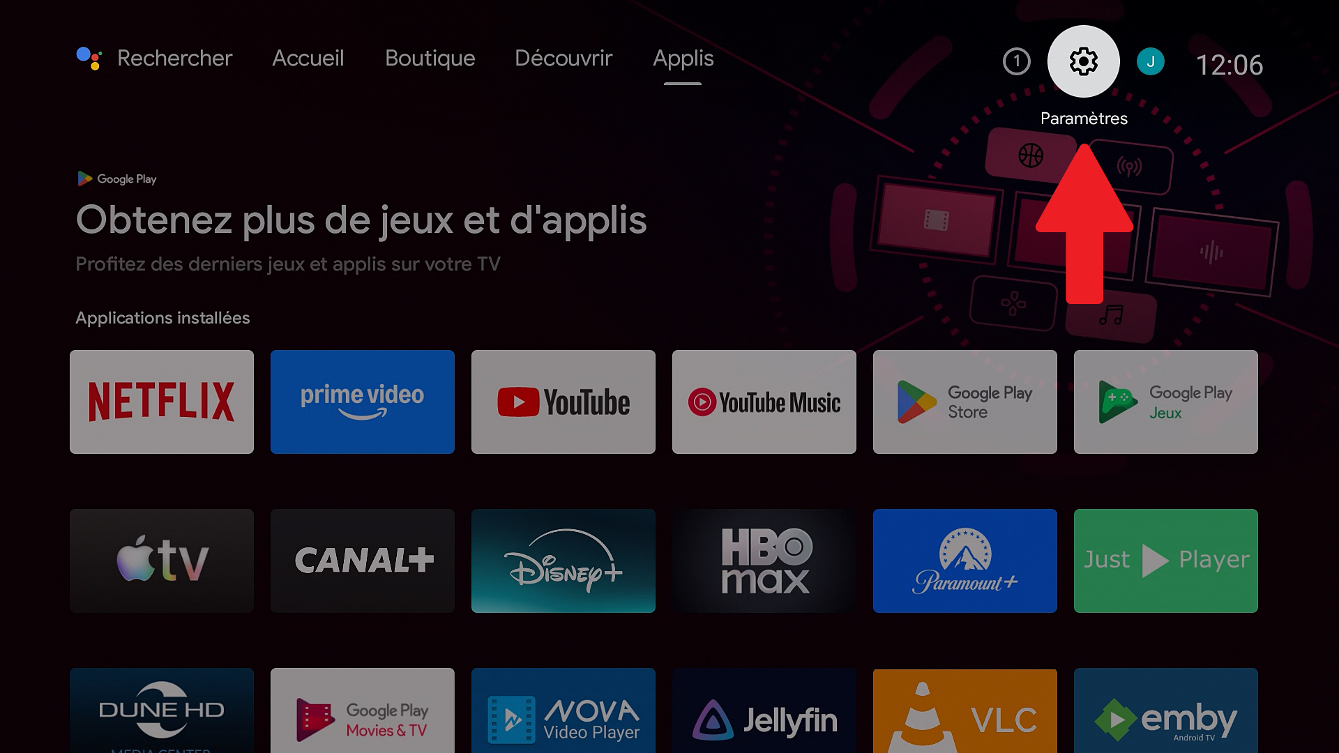 Allez dans Apps > Android TV. Puis pressez la touche FLECHE DROITE de la télécommande principale pour aller sur l'icône illustrée d'une icône engrenage, placée en haut à droite de l'interface Android TV.