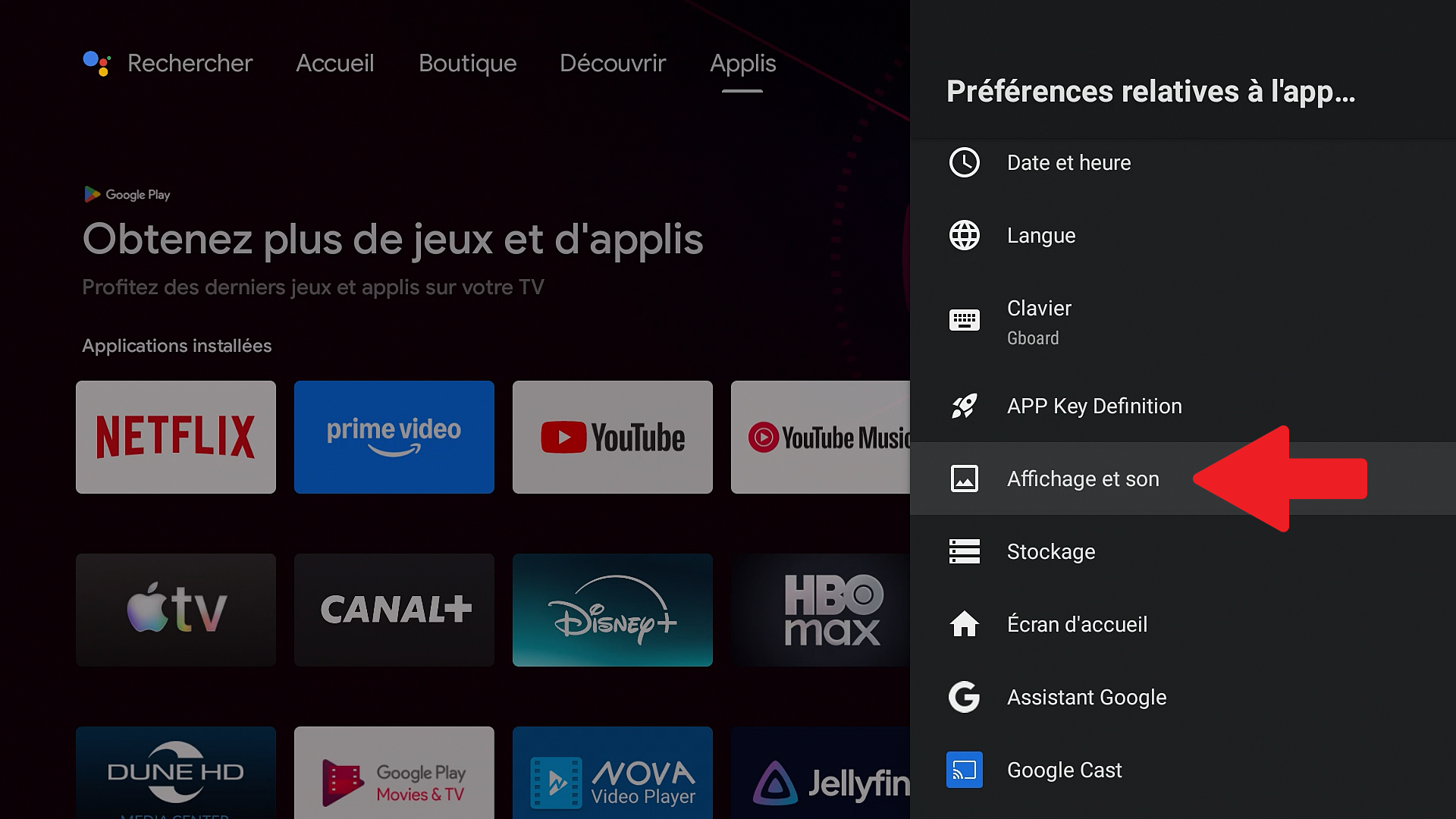 Pour régler la sortie son de la partie Android TV, procédez comme suit :